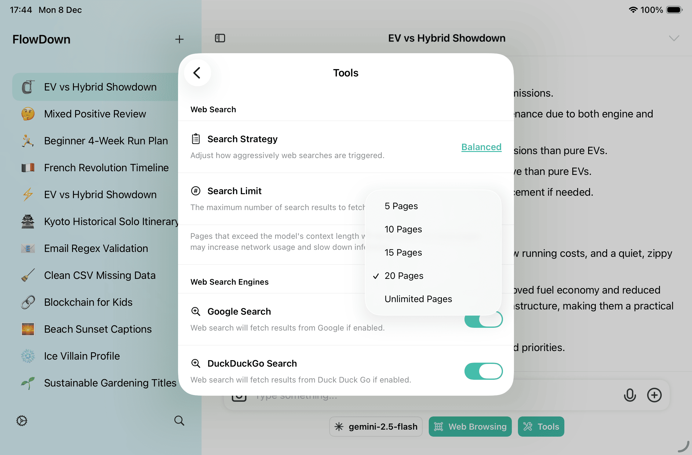 - Web Search Engines lets you toggle Google / DuckDuckGo / Yahoo / Bing. Keep at least one on; if all are off, FlowDown automatically falls back to Google.